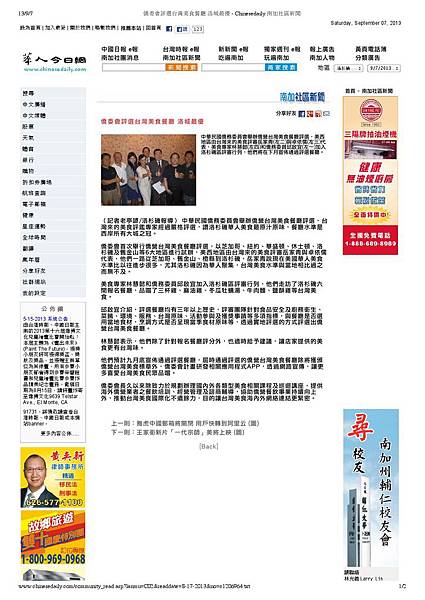 (記者老亭諺/洛杉磯報導) 中華民國僑務委員會舉辦僑營台灣美食餐廳評選,台灣來的美食評鑑專家經過嚴格評選,讚洛杉磯華人美食最原汁原味,餐廳水準是西岸所有大城之冠。僑委會首次舉行僑營台灣美食餐廳評選,以芝加哥、紐約、華盛頓、休士頓、洛杉磯及舊金山等6大地區進行試辦,美西地區由台灣來的美食評審岳家青與卓依儒代表,他們一路從芝加哥、舊金山、橙縣到洛杉磯,岳家青說現在美國華人美食水準比以往進步很多,尤其洛杉磯因為華人聚集,台灣美食水準與當地相比過之而無不及。美食專家林慧懿和僑務委員邱啟宜加入洛杉磯區評審行列,他們走訪了洛杉磯六間報名餐廳,品嚐了三杯雞、麻油雞、冬瓜牡蠣湯、牛肉麵、鹽酥雞等台灣美食。邱啟宜介紹,評選餐廳均有三年以上歷史,評審團隊針對食品安全及廚務衛生、菜餚、環境、服務、台灣原味、活動參與及獲獎事蹟等多項指標,與餐廳是否選用當地食材,烹調方式是否呈現當季食材原味等,透過實地評選的方式評選出僑營台灣美食餐廳。林慧懿表示,他們除了針對報名餐廳評分外,也適時給予建議,讓店家提供的美食更有台灣味。